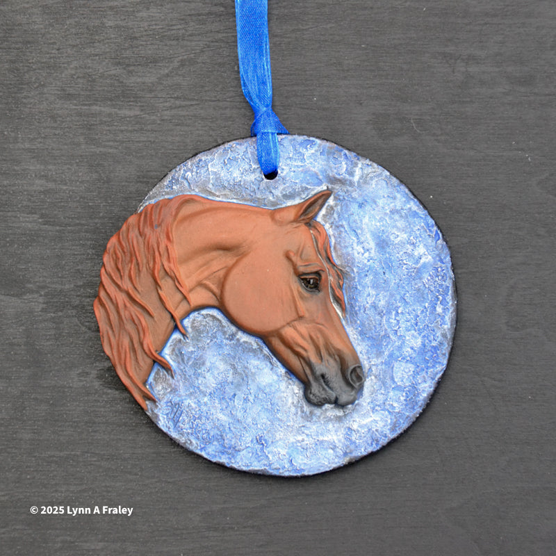 Refined horse head ornament, sculpted in relief by Lynn Fraley. Cast resin, 3” diam.