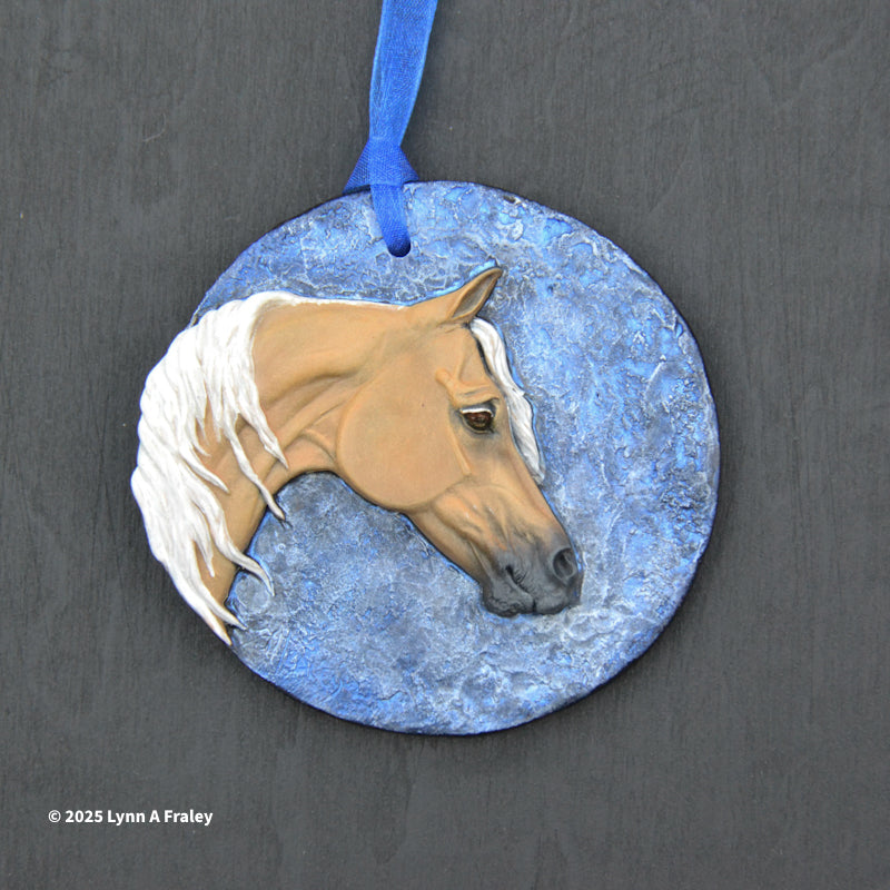 Hand painted a golden palomino with pearlescent indigo blue background by Lynn Fraley.