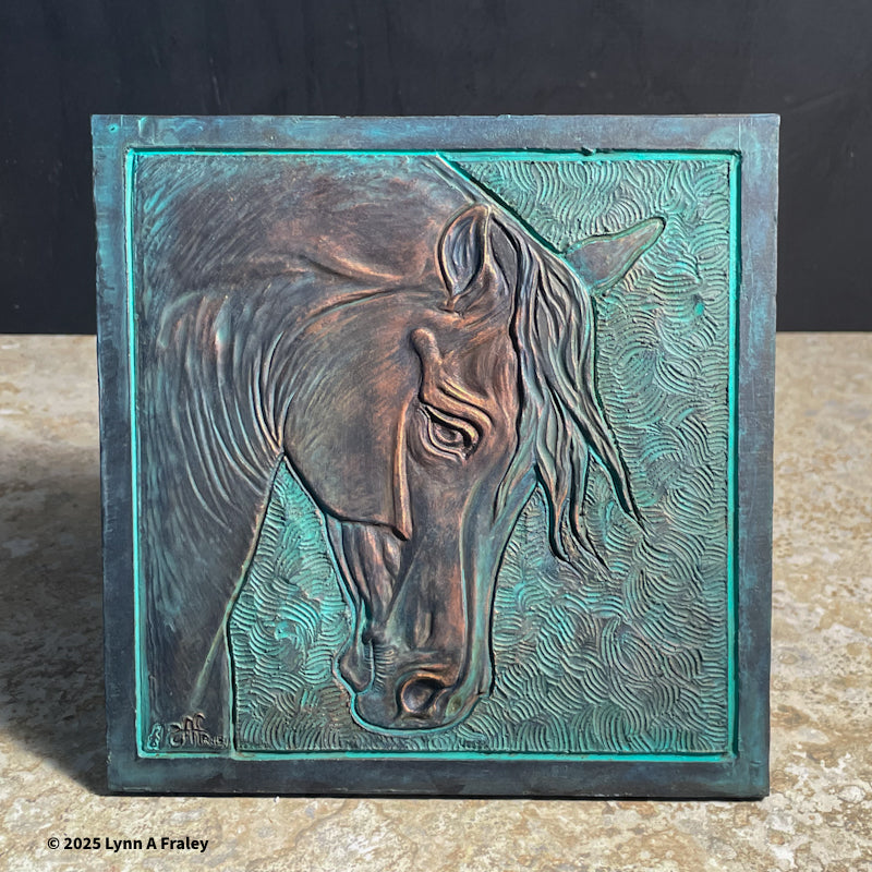 The storied élan of the Arabian horse has captivated hearts for untold generations. This tile was sculpted in a manner that employs both low and incised relief. Many thin layers of paint create nuances in shade and shadow as pigments pool in low areas, highlights begin to glow with each dusting pass of a soft brush.