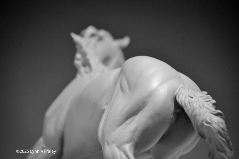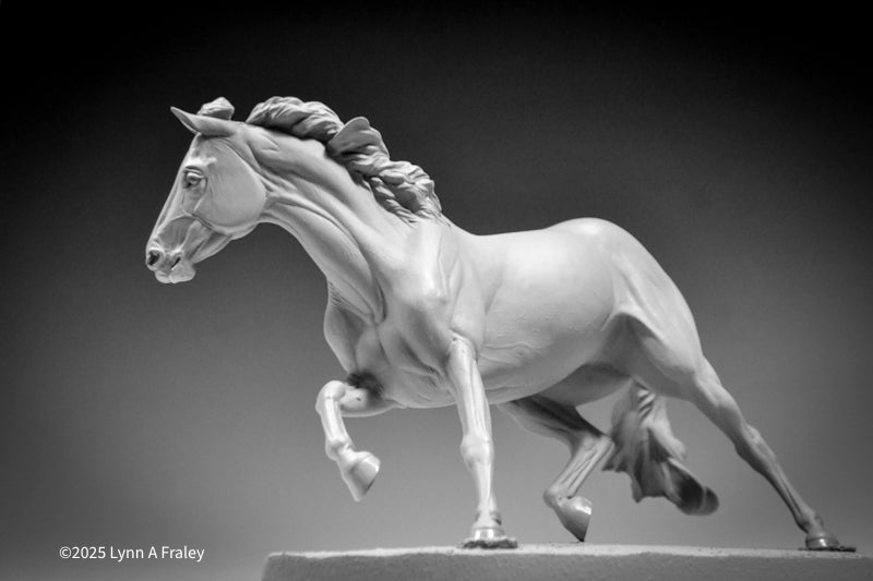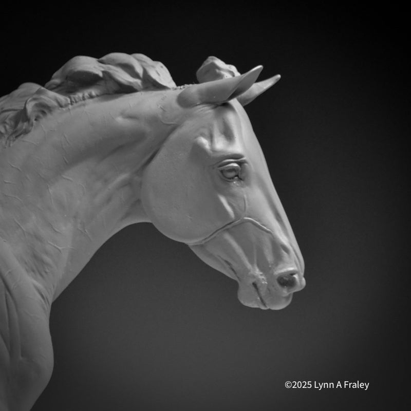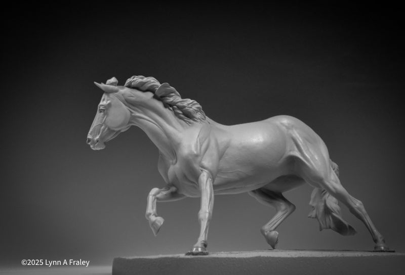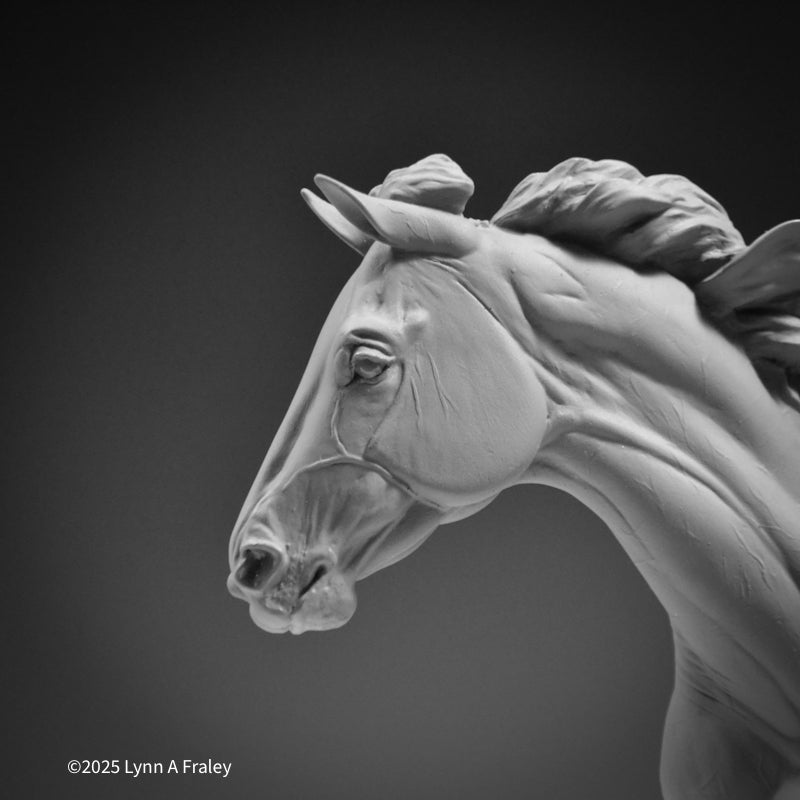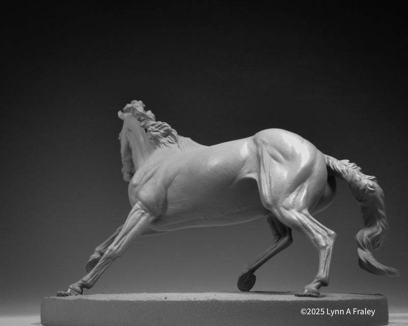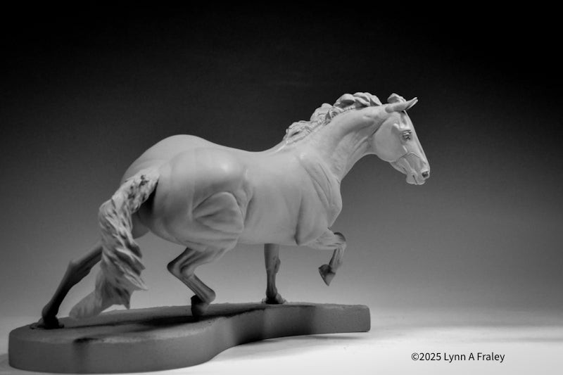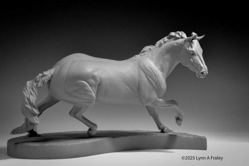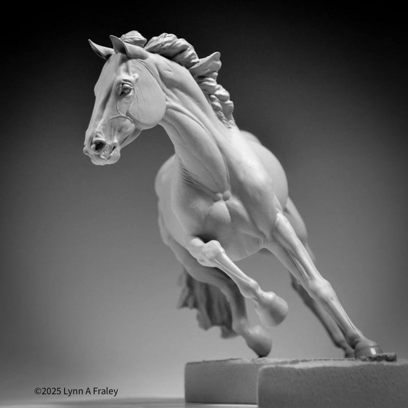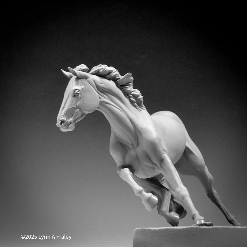 Glory is a “traditional” (1:9) scale resin, 13.5″ long x 10″ tall (measurements include the base). This sculpture is cast in white polyurethane resin, with a shore hardness of 70D. Metal supports are cast into the legs. She is removable from her base for ease in shipping, painting and long term storage. This sculpture features a new system for securing the sculpture into the base with a built-in bolt and nut.